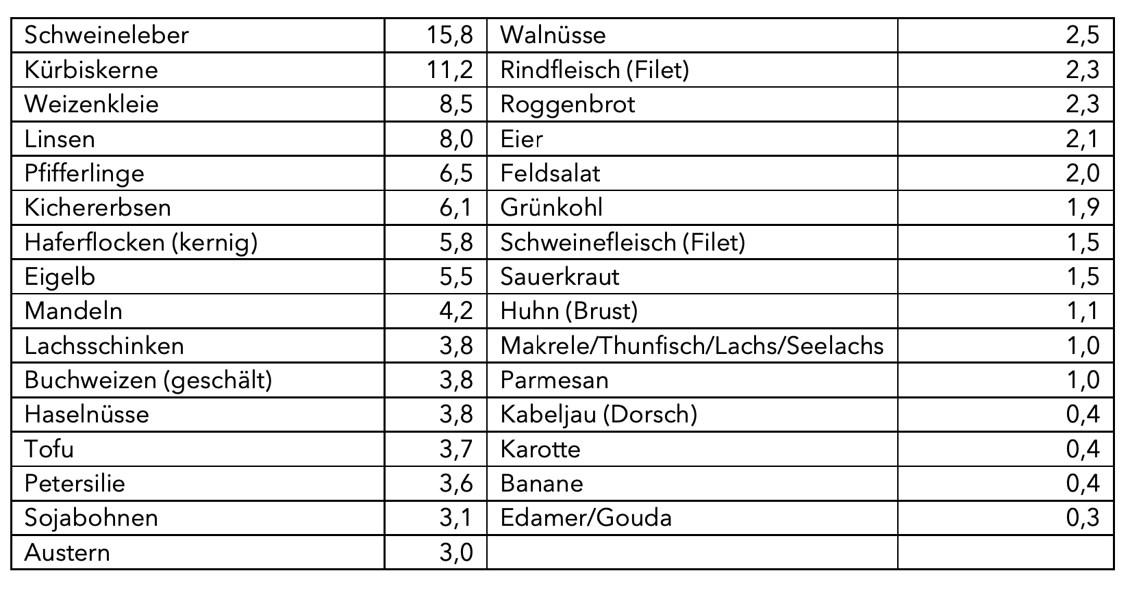 Beispiele für eisenhaltige Lebensmittel, Angaben in mg/100 g: